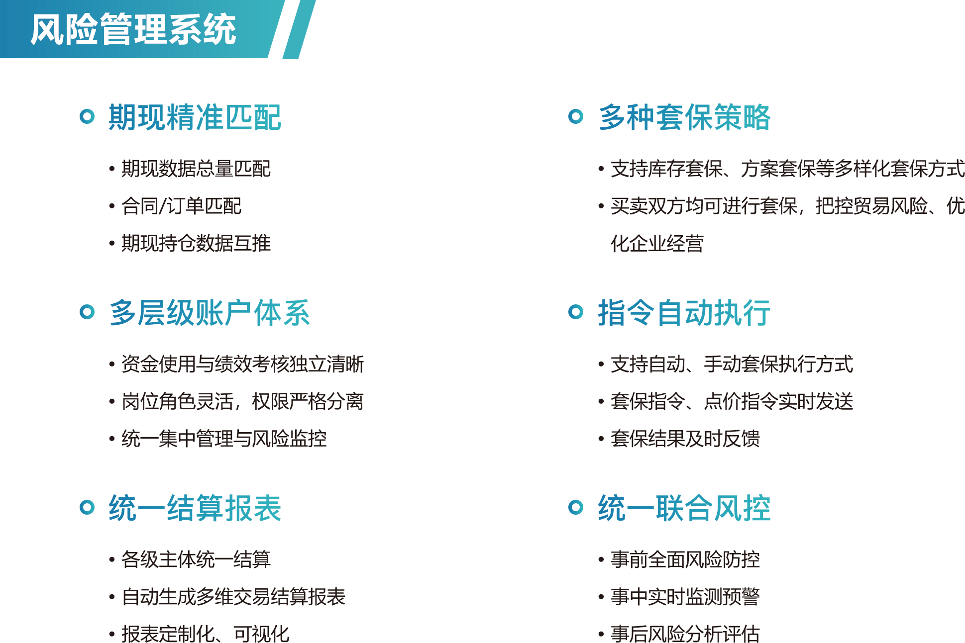——风险管理系统。为企业量身定制,满足企业集团化管理的套期保值业务需求。通过套保方案构建与套保指令流程,实现风险管控、自动结算、期现匹配、统计分析等功能,可与现货业务管理系统对接,为企业搭建针对期现业务的整体服务体系。